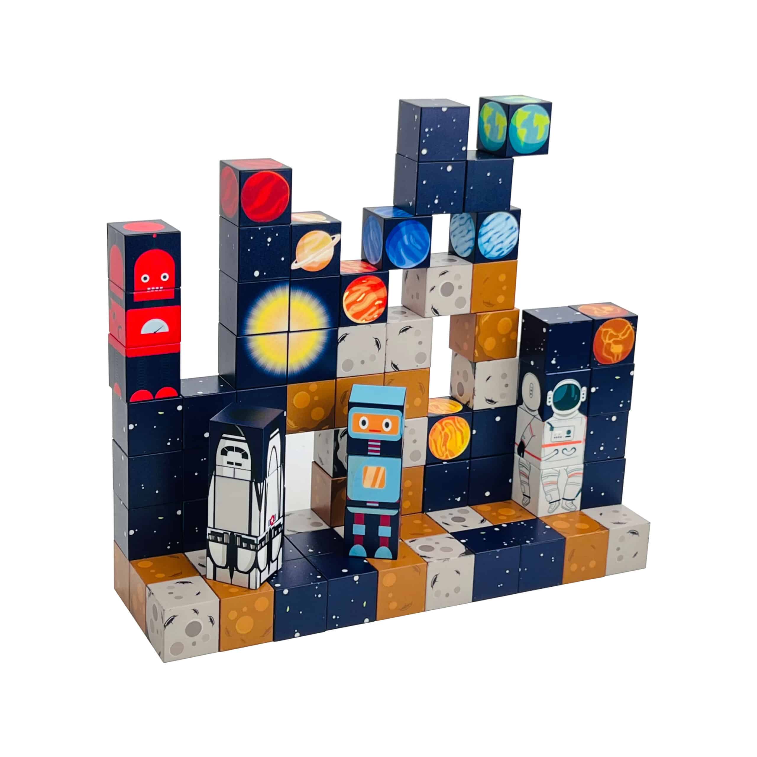 Tag på eventyr i det ydre rum med MagCubes – et kreativt og lærerigt magnetisk byggesæt med 100 dele. Klodserne er designet med farver og mønstre inspireret af stjerner, planeter, rumstationer og gala
