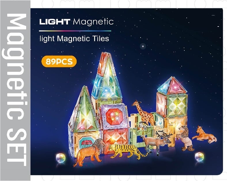 Udforsk en farverig verden med Magnetic Tiles med Dyr og Lys!
