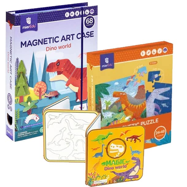 Med denne spændende mierEdu sampak kan børn dykke ned i dinosaurernes verden gennem leg og læring. Sættet indeholder et magnet-puslespil, en vandmalebog og en magnetisk krea-boks/magnetbog, der tilsammen giver børn sjove og lærer